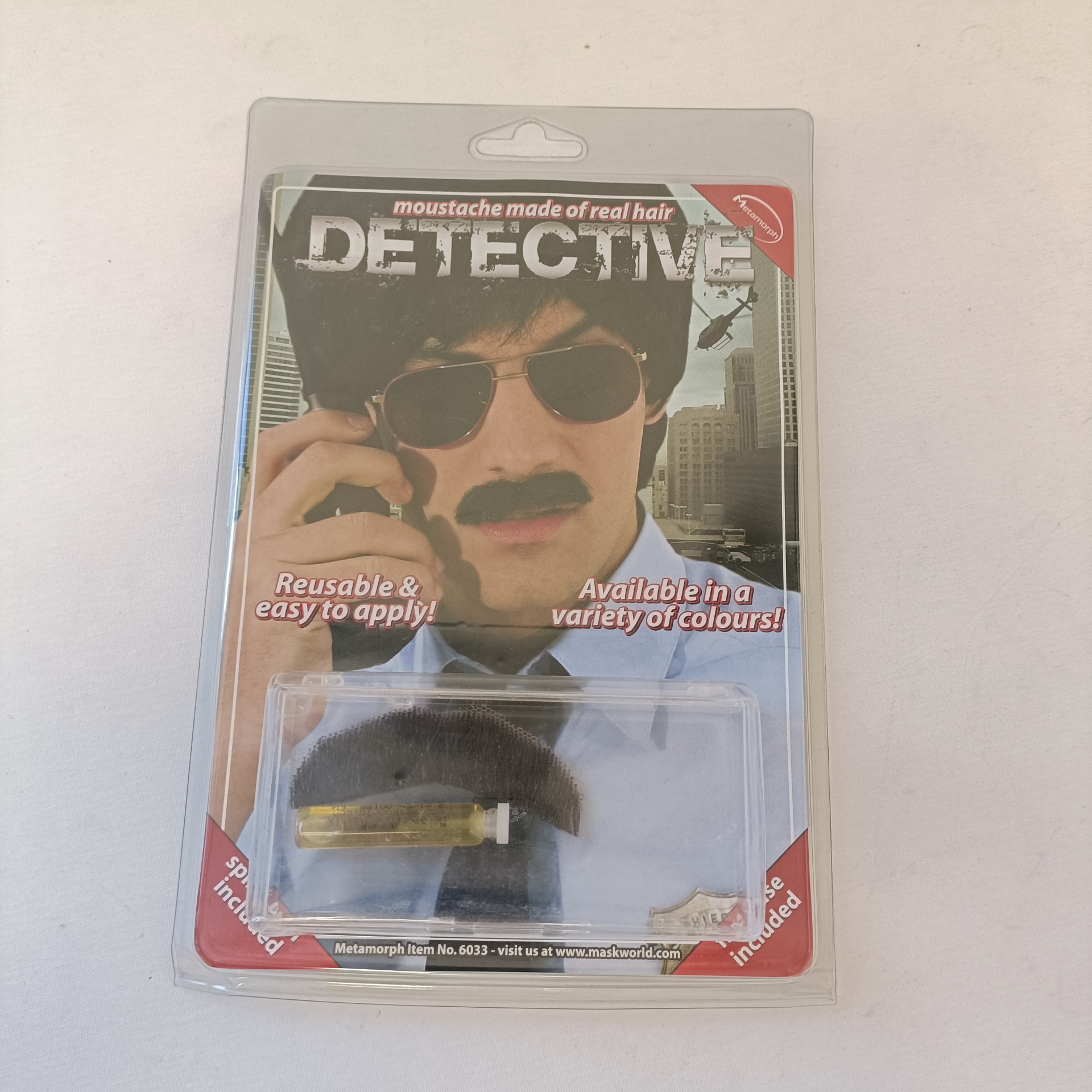 Pakkaus sisältää tummanruskeat etsivän viikset sekä kiinnitysliiman.