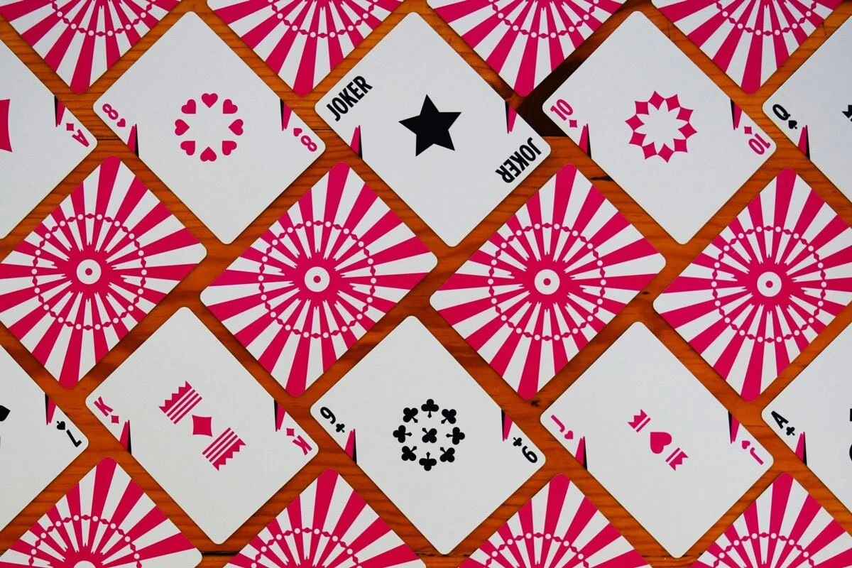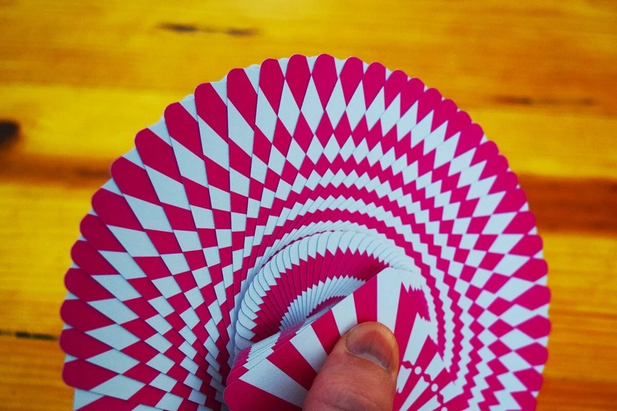 Siinä on kirkas magentan värinen reunaton auringonsädekuvio takana, graafiset kuvakortit ja reunamuotoilu kasvoissa, jotka parantavat viuhkoja ja levityksiä. Pakka näyttää upealta viuhkoissa ja levityksissä.
