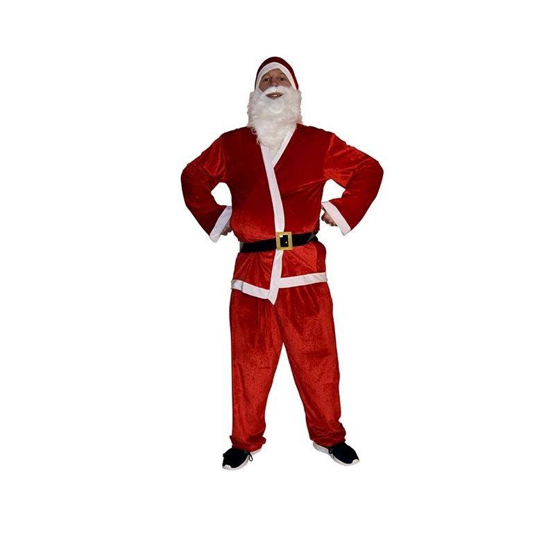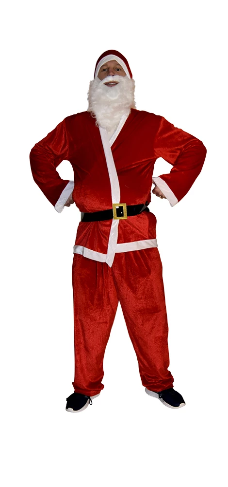 Aikuisten asu sisältää takin, housut, vyön, hatun ja parran.