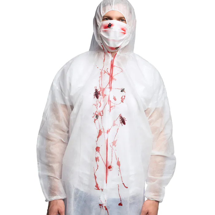 Kauhistuttava asu kauhutohtoriksi tai laboratorioteknikoksi. Tässä valkoisessa haalarissa on realistisia veriroiskeita ja torakoita, jotka tekevät unohtumattoman vaikutuksen ja saavat kylmiä väreitä kanssajuhlijoihisi.